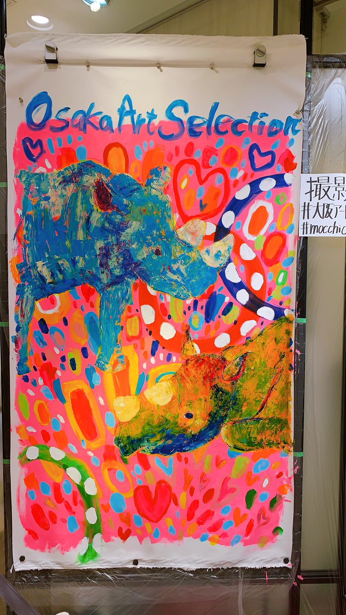 初サイ❣️🦏 天王寺動物園のライくんとサミアちゃんをモデルに描きました🎨 予定より1時間くらいオーバーしたけど営業時間内に完成させました🎊 疲労困憊!でもむちゃくちゃ楽しい時間でした!10/12(火)まで大阪高島屋さんで展示販売してるので見に来てねー🌈💖 #大阪アートセレクション #mocchicolor