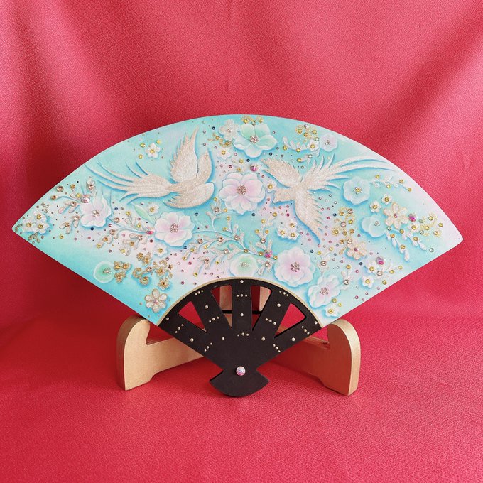 天地様お衣装イメージを扇子型woodに描いてみました〜😽🎨🖌 自分だけのオリジナルグッズ👍 ストーン💎を沢山つけてめいっぱいキラキラさせました✨✨✨ 動画だと少しキラキラわかります🎶⬇️ #天と地と #扇子 #羽生結弦選手お衣装 #YuzuruHanyu𓃵 #トールペイントでファンアート #羽クリエイティブ