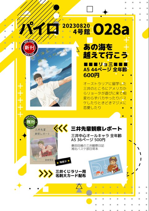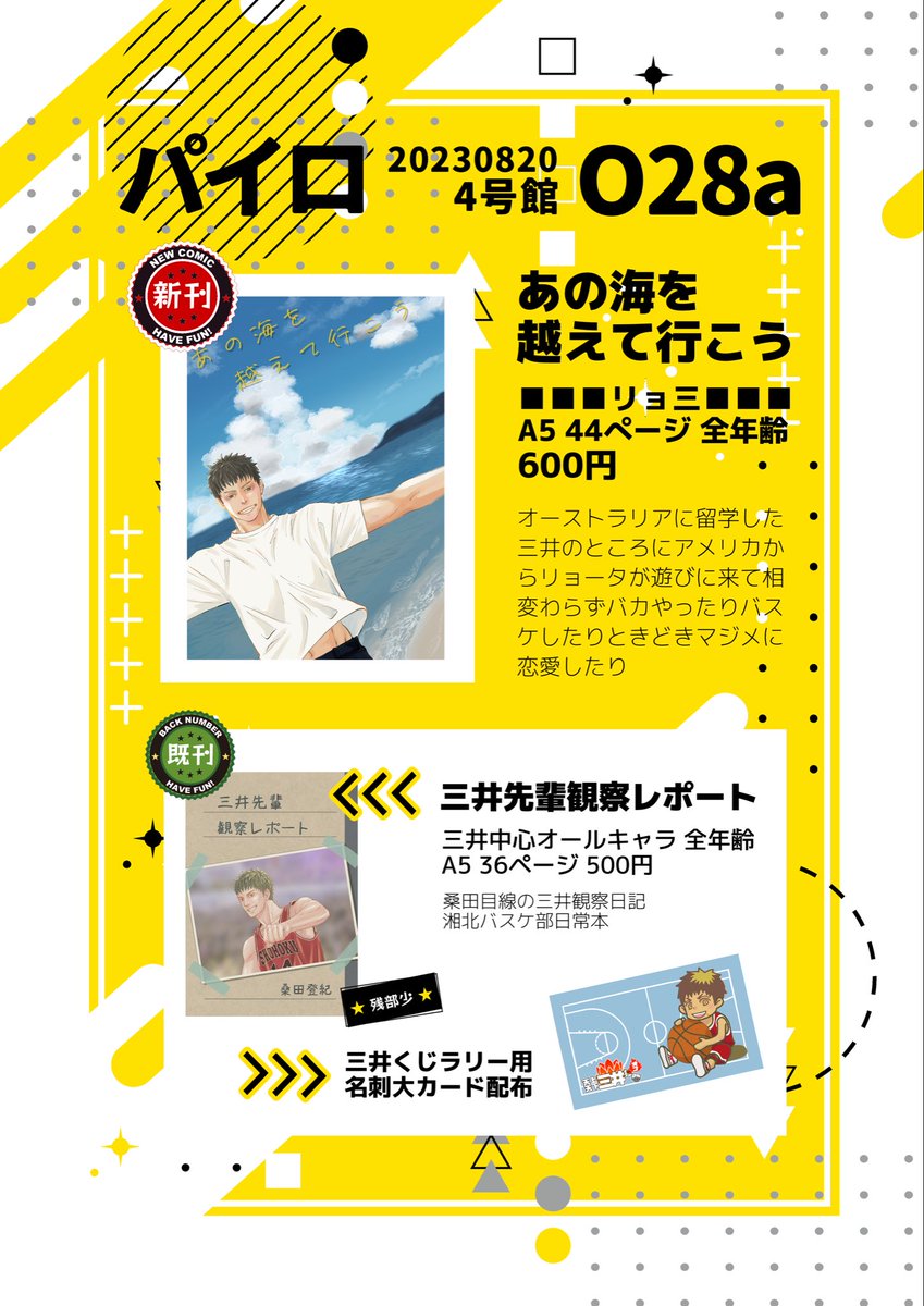 8/20インテ【4号館O28a】お品書き ●新刊リョ三漫画 『あの海を越えて行こう』 A5 44ページ 全年齢 600円 ●既刊三井中心オールキャラ漫画 『三井先輩観察レポート』(残部少) A5 36ページ 全年齢 500円 #天上天下三井独尊5オフ #独尊5ミツイクジラリー 新刊サンプルはツリーへ
