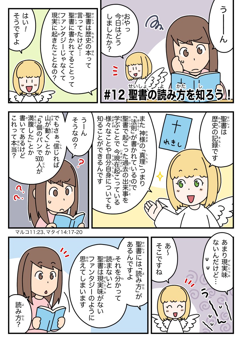 【ゆるく更新中】天使ちゃん聖書学習まんが 第12話「聖書の読み方を知ろう!」 ほぼ1年ぶりに描いたのでキャラの描き方忘れてました!笑 #漫画が読めるハッシュタグ #聖書 #天使ちゃん漫画 #キリスト教福音宣教会