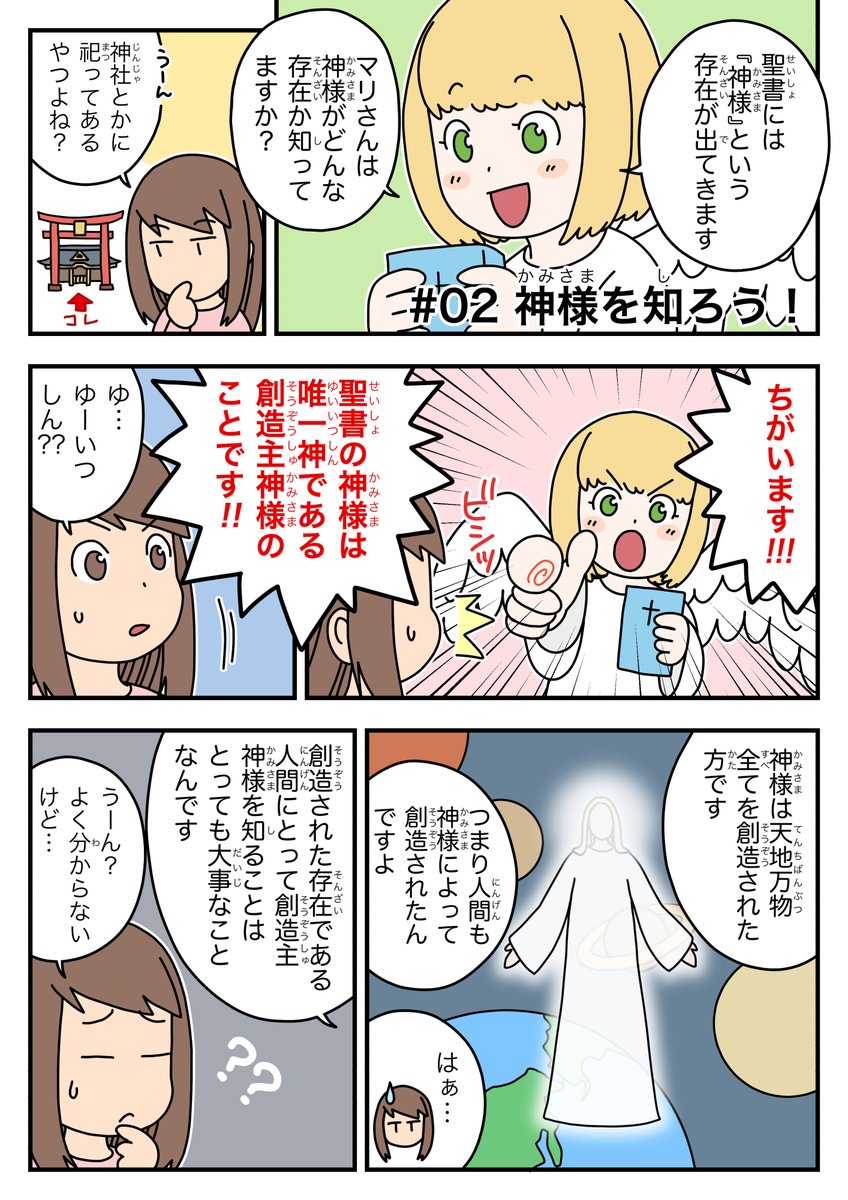 【ゆるく更新中】天使ちゃん聖書学習まんが 第2話「神様を知ろう!」 現在、第2話の動画も制作中です! お楽しみに〜✨✨ #漫画 #絵描きさんと繫がりたい #漫画が読めるハッシュタグ #学習まんが #聖書 #天使ちゃん漫画
