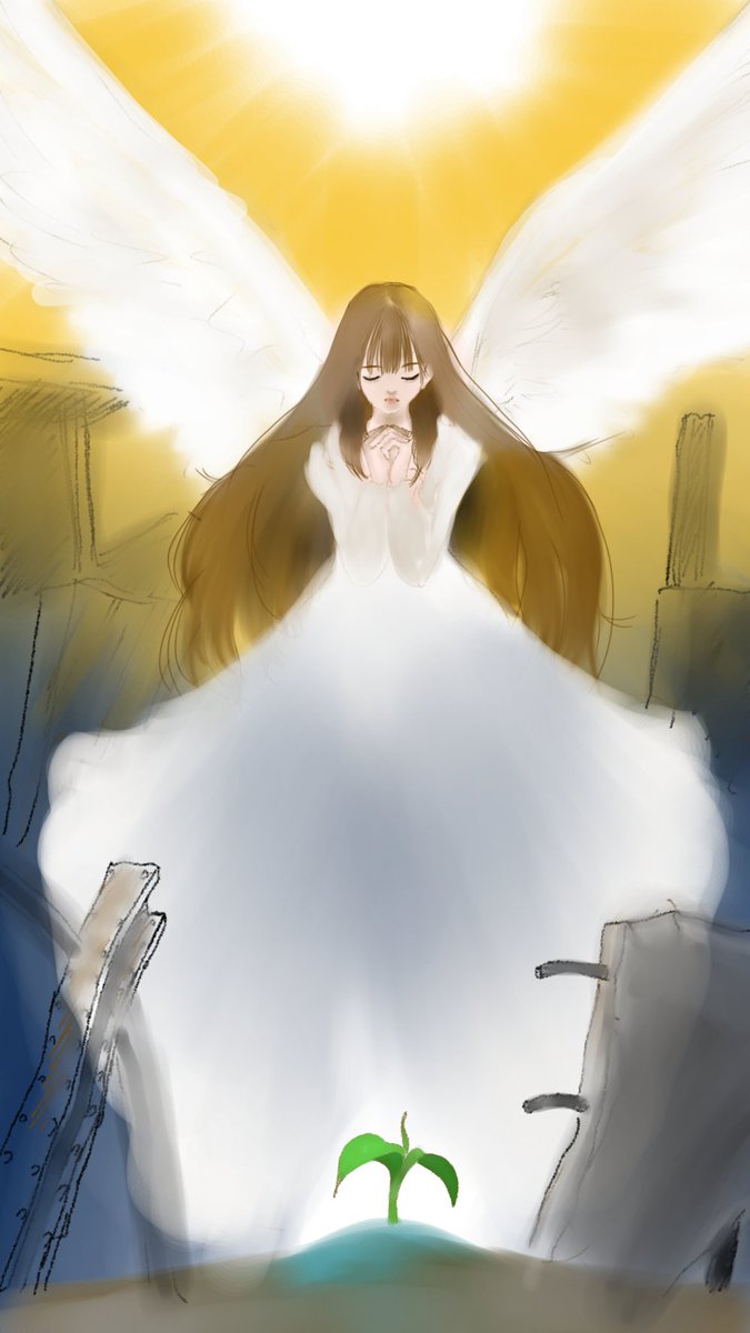 #イラスト #創作イラスト #イラスト好きさんと繋がりたい #絵描きさんと繋がりたい #天使の絵 昨日は広島原爆投下の日でした😐 瓦礫の中で芽吹いた命に、天使は祈ります・・・・ 「生まれた状況がどんなに過酷でも、折れぬように、腐らぬように、精一杯その命を全うしておくれ」・・・と。