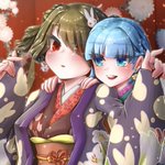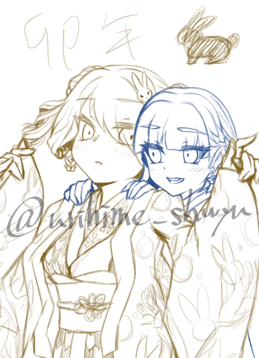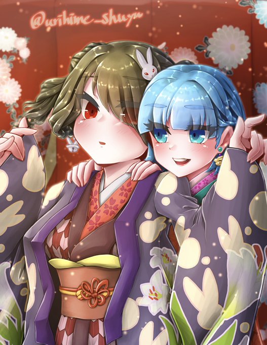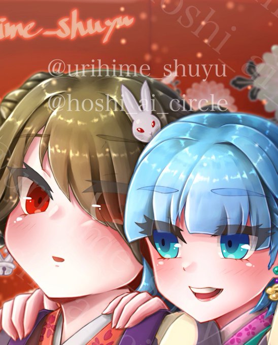 文字なしver.も掲載します!! この絵では、サークル作品「天啓聖女」シリーズの登場キャラを描きました ユシア様(水色髪)がベルちゃん(黒髪)の着物をコーディネートしている場面です (どんな会話をしながら着物を選んでいるのか…皆様のご想像にお任せします) #イラスト #illustration #天啓聖女