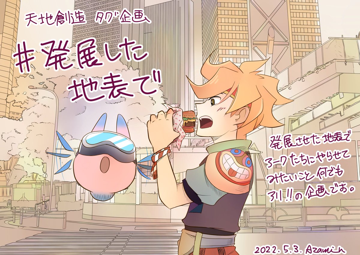天地創造の発展した地表でアーク達にやらせてみたい事何でもあり!のコンセプトで、5月中ちょこちょこ天地創造絵を描こうと思います😄 参加自由なのでよかったらタグ使って遊んで下さい✨過去絵もOK♪ #発展した地表で #天地創造 twitter.com/azamin_fun/sta…