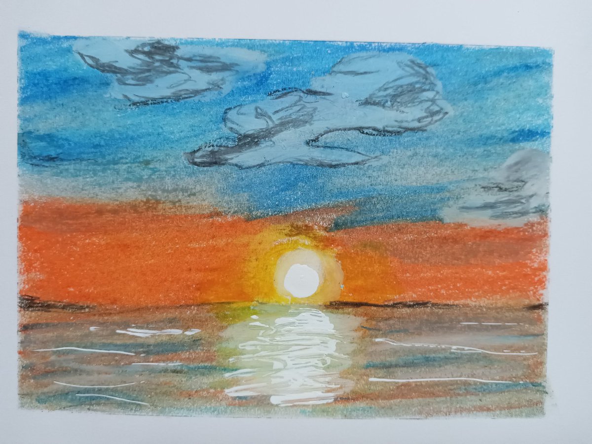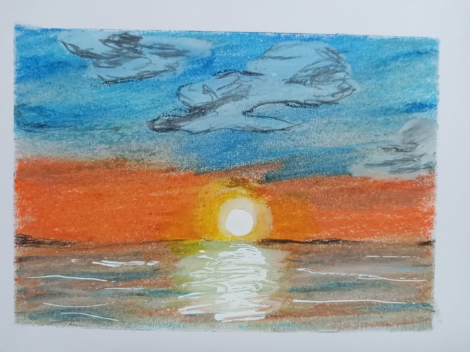 創作パステル画 「カコ」 いつか見た山の夜明け。 遠い日の事か。 偽りの記憶か。 今はもう思い出の欠片。 #オイルパステル #天王区 #雲 #山 #天使の梯子 #ネイチャーヒーリング #絵描きさんと繋がりたい #アナログイラスト #イラスト好きと繋がりたい #みんなで楽しむTwitter展覧会
