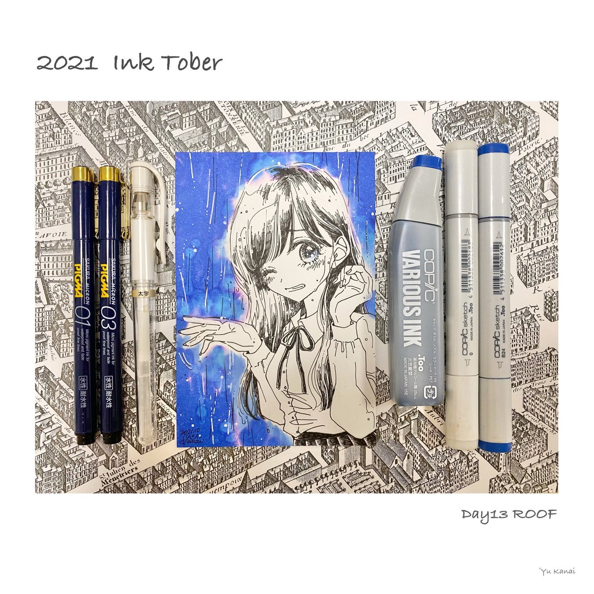 Inktober day.13 roof 思っていたより濡れちゃったねぇ💦 雨宿りの意味ないかなぁ。 #inktober #inktober2021 #inktoberday13 #inktober2021day13 #インクトーバー #インクトーバー2021 #女の子と恋のお話