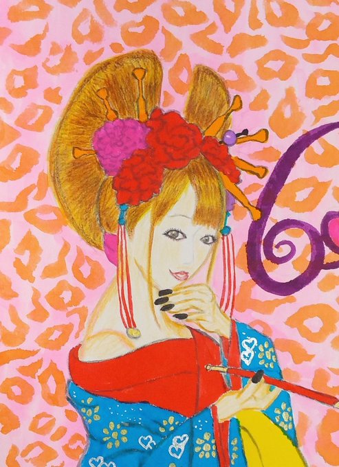 おはようございます🥰☀️✨️ ◆花魁の女の子 「ヒョウ柄の壁に模様替え💕」 #イラスト #絵描きさんと繋がりたい #アナログイラスト #みんなで楽しむTwitter展覧会 #秋の創作クラスタフォロー祭り #女の子のイラストだけで興味を持ってくれる方へ届け