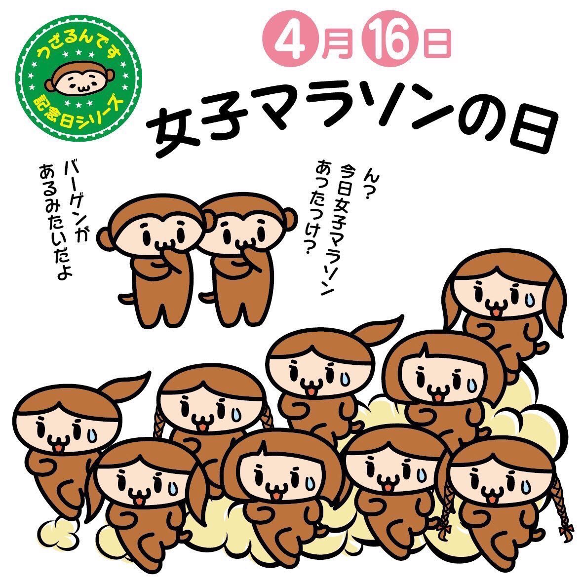 4月16日は女子マラソンの日。1978年、日本初の女子フルマラソンの大会が東京で開催された日です。参加者は最高71歳を含めわずか49人でしたが、沿道には10万人を超える大観衆が!高齢の走者もいたのでゆっくり走ってもよいというルールだったんですって〜 #女子マラソン #イラスト好きさんと繋がりたい