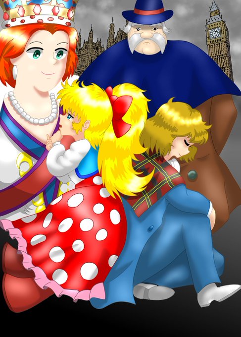 「アンジェにおまかせ」 ビクトリア女王に守られて難事件を解決するアンジェとスコットランドヤードの二人の似顔絵を描いてみました。 新婚旅行でイギリスに行ったのに奥さんにこのアニメ知らないって言われちゃいました😭 #女王陛下のプティアンジェ #プティアンジェ