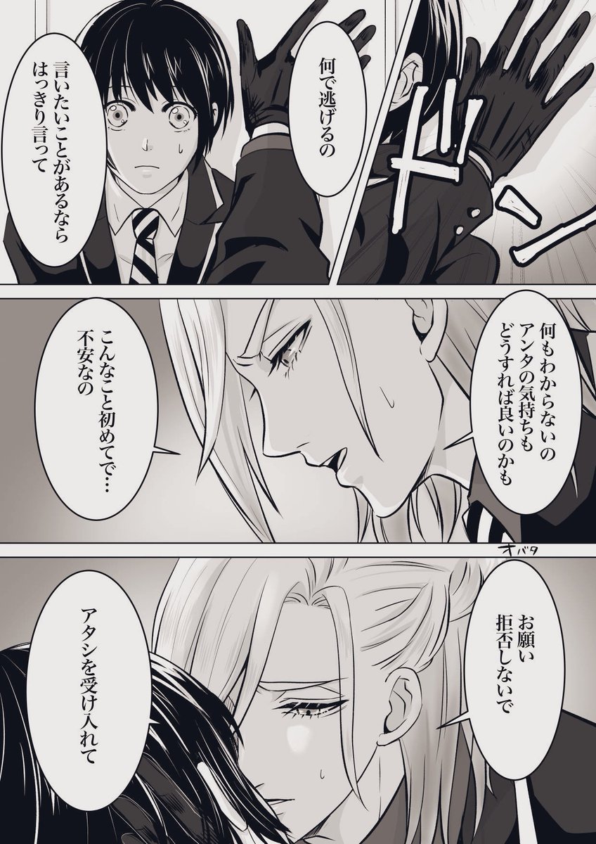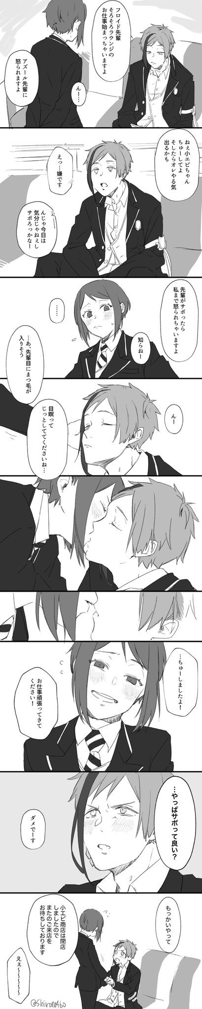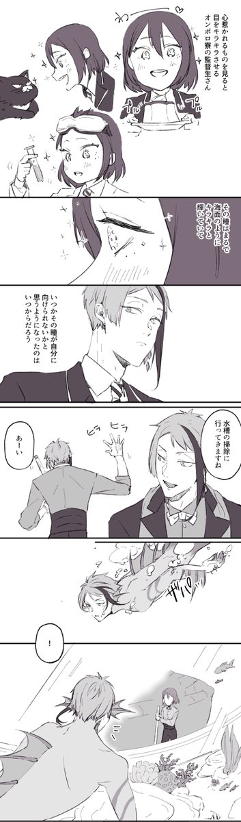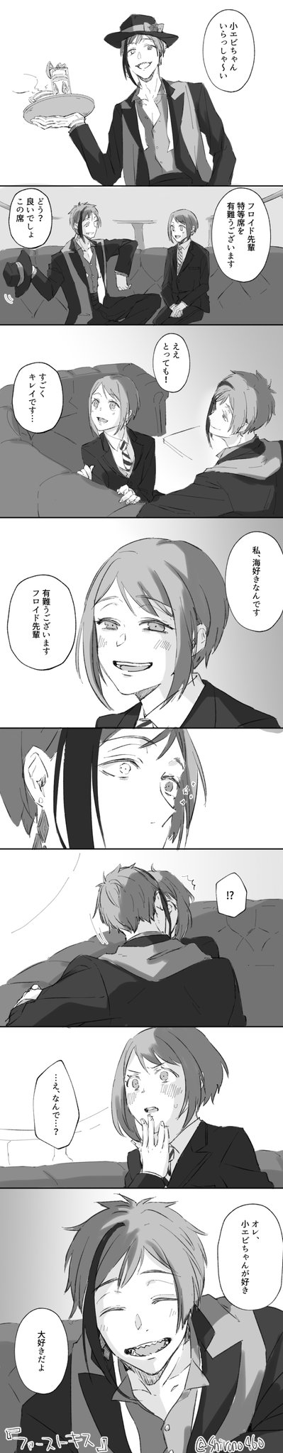 お題『ファーストキス』 フロ監🦈🦐(女監督生) 大遅刻で描くのやめようかと思ったけど折角なので最後まで描いてみた。 衝動で動いちゃう🦈も良いよね。 そしてモストロ営業中の出来事だったので一部始終を見てた客と従業員がこの後どんちゃん騒ぎする。 #女監督生受け版ワンドロワンライ #twstプラス