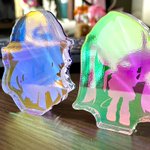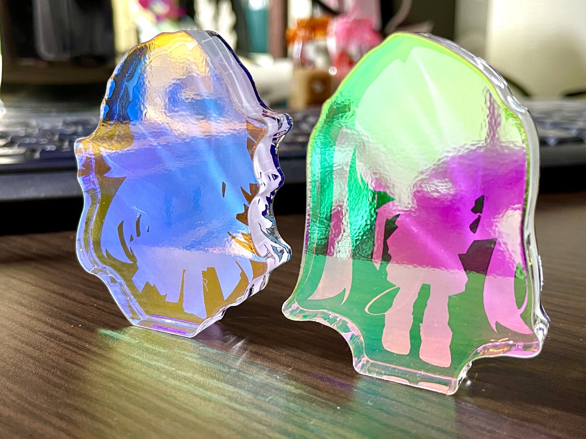 当たる光によって変わる色合いといい、偏光アクリルプリズムの加工が面白すぎてトキメキます✨ うわー!試作して良かった✨✨ 実物を10月15日の村民集会で展示しますので、良かったら見に来て下さい😊✨ #好きを形にトリニティ