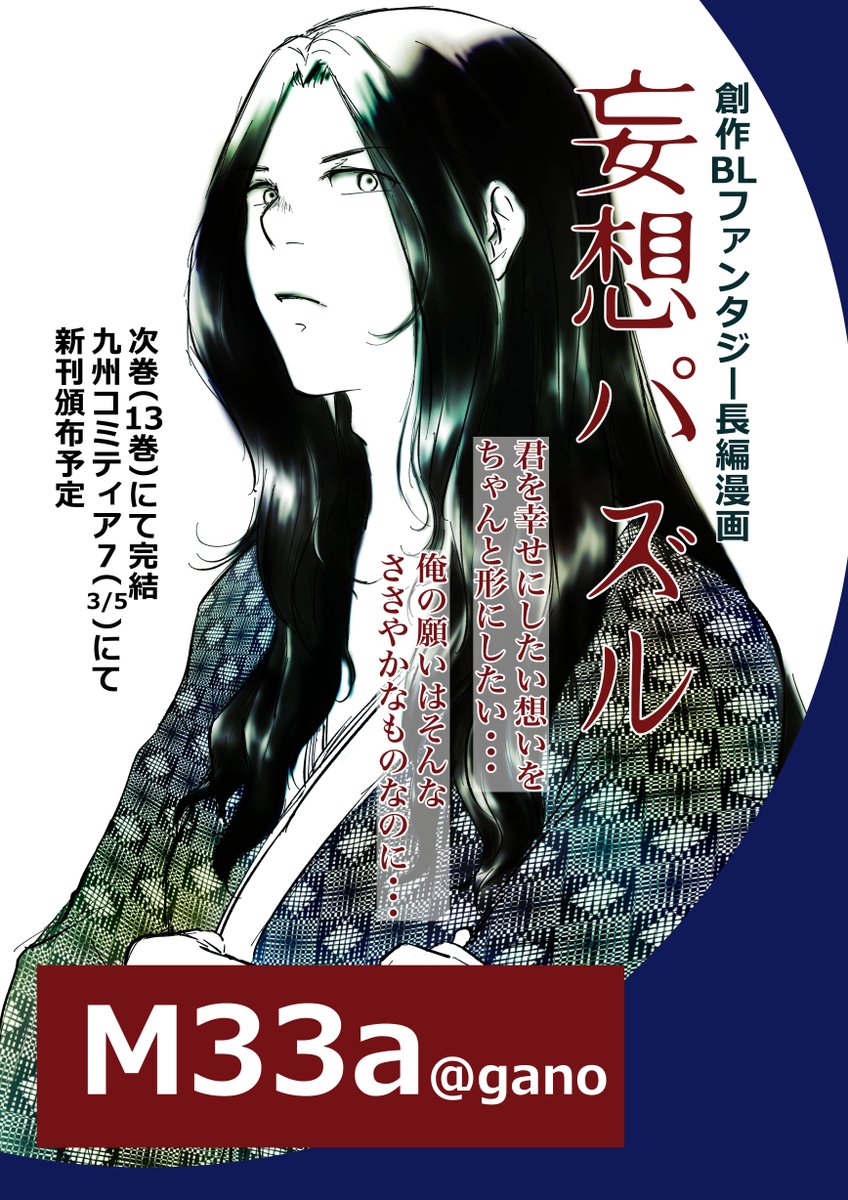 2021年より #創作BL漫画 『 #妄想パズル 』(長編)を描き13巻で完結済。 (サークル名:gano) 内容にBL表現が若干ありますが大筋はSF×ファンタジーのスピリチュアル系マンガ。 男女問わず読みやすい作品かと思います。 ◆第一話サンプル pixiv.net/artworks/87384… ◆BOOTH 1095gano.booth.pm