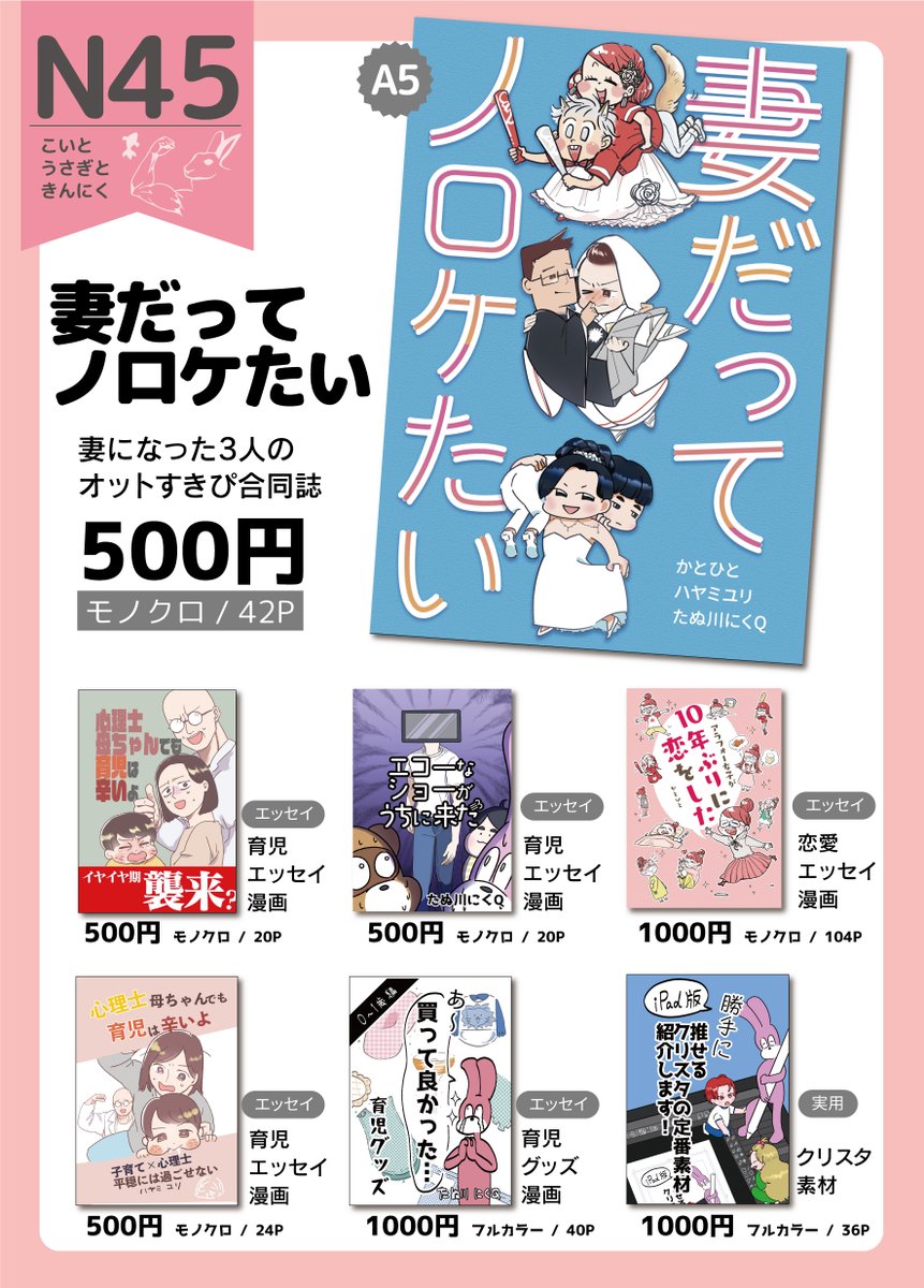 【告知】 2022年5月5日のコミティアにたぬ川にくQちゃんとハヤミユリちゃんとの合同誌『妻だってノロケたい』発行します!\(^o^)/ よろしくお願いいたします🎶 (かとひとは当日欠席ですスミマセン😭) モノクロ36P #コミティア140 #COMITIA140 #漫画が読めるハッシュタグ #妻だってノロケたい