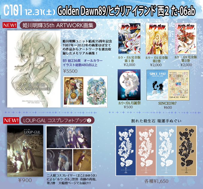 【コミケ101お品書き】 12/31(土)西2[た]06ab GoldenDawn89/ヒウリアイランド 新刊は 「 #姫川明輝35th画集 」 「ルウ・ガルコスプレフォトブックII」 現金の他にクレジット決済・PayPayも使えます。よろしくお願いします。スペースにてお待ちしております!(続く) #C101 #C101お品書き