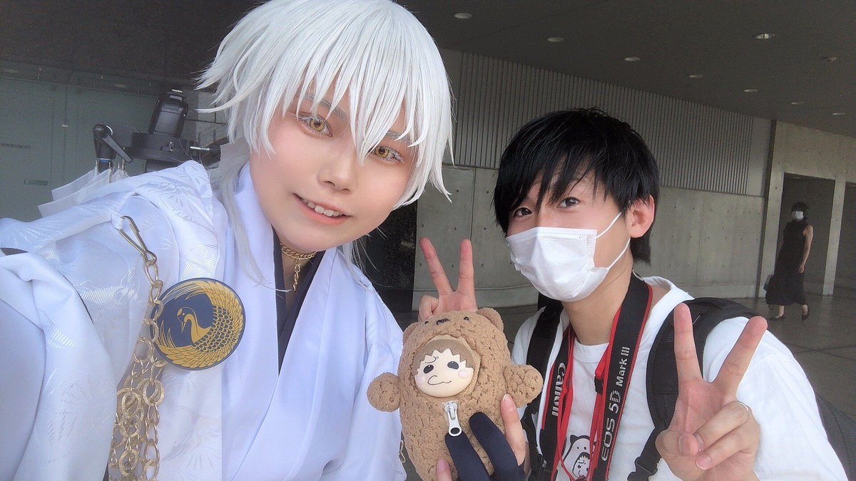 ※コスプレ 【本日の速報】 バグってたので上げ直し…! acosta!京都駅ビルに鶴丸国永で参加しておりました! めちゃくちゃ暑くて汗だくだし、テーピングも秒でお亡くなりになった、、、 無事、中村さんとお兄さんにも会えました🥳 #アコスタ京都駅ビル #中村盛れる #姫美那ウィッグ