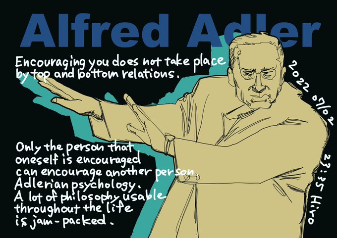 アルフレッド・アドラー(1870~1937)。勇気づけはタテの関係ではありえない。自分を勇気づけられる者だけが、他人を勇気づけることができる。アドラー心理学。一生使える哲学がぎゅうぎゅう詰まってる #イラスト #illust #アルフレッドアドラー #alfredadrer #嫌われる勇気