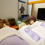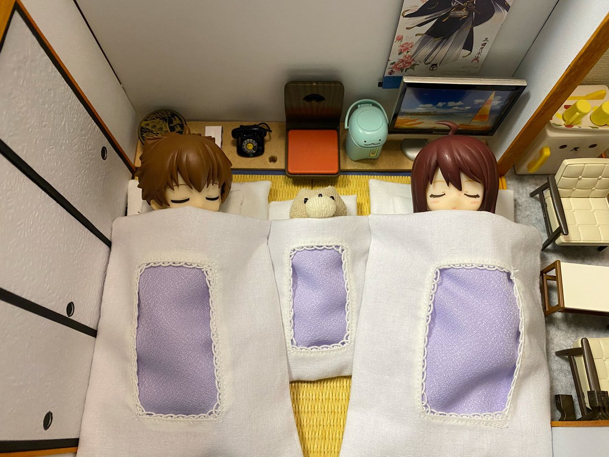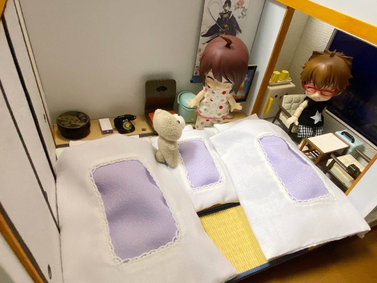 お布団3組のボタン付け終わりました😊 和室に家具を置いてお布団敷いてみました😊 それでもぎゅうぎゅうなんですけど少しはマシに😆💦 グリちゃん、フカフカお布団嬉しいかな? みんなで川の字でお話しして寝ましょうね😊 おやすみなさい☺️ #キューポッシュ #子ぐまのグリちゃん #キュポ和のお宿