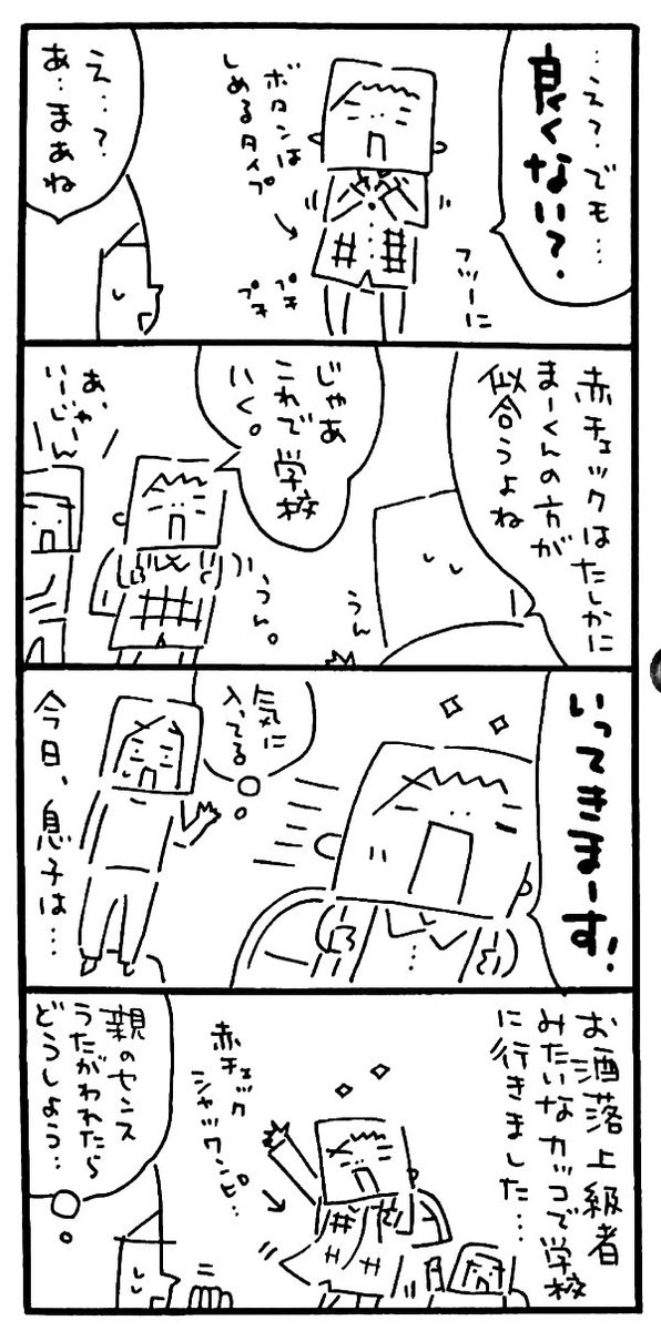 👕おさがりでもらった赤チェックシャツ おしゃれ上級者みたいになってた まぁ可愛かったんだけどね #キッズファッション #子供服 #おさがり #4コマ #4コマ漫画 #漫画 #イラスト #イラストレーター #エッセイ #イラスト好きな人と繋がりたい #絵描きさんと繫がりたい #漫画が読めるハッシュタグ