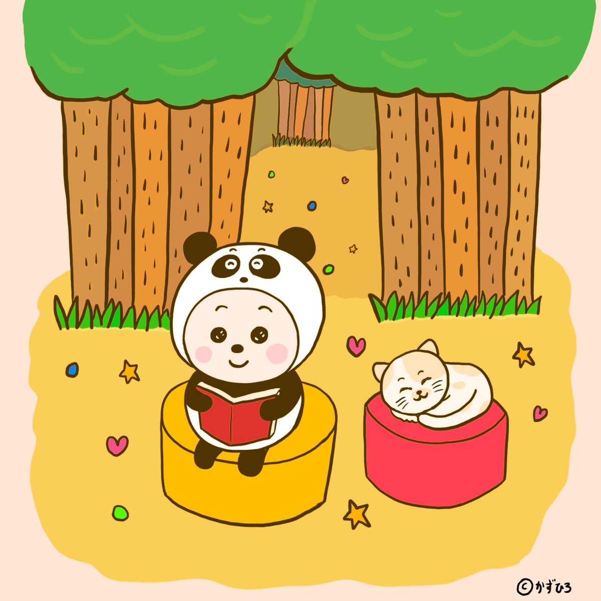 パジャまる。『夢の世界の森の中でネコちゃんが寝ている横で本を読んだよ😊📕』 #イラスト #イラスト好きと繋がりたい #絵 #絵描きさんと繋がりたい #絵柄が好みって人にフォローされたい #ゆるい絵 #ゆるいイラスト #ゆるキャラ #夢 #子供 #どうぶつ #猫 #ねこ