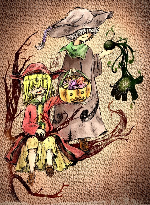 創作【魔女の魔種】ハロウィンイラスト 枝造形のアココ&蔓造形のブレン 相性最強な2人は兄妹の様に仲がいい! #香辛料シナモン #子魔女 #創作 #創作イラスト #ハロウィンイラスト #ハロウィン2021