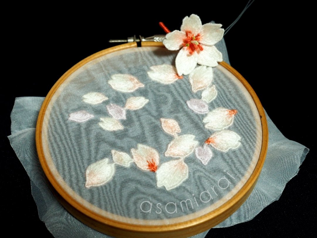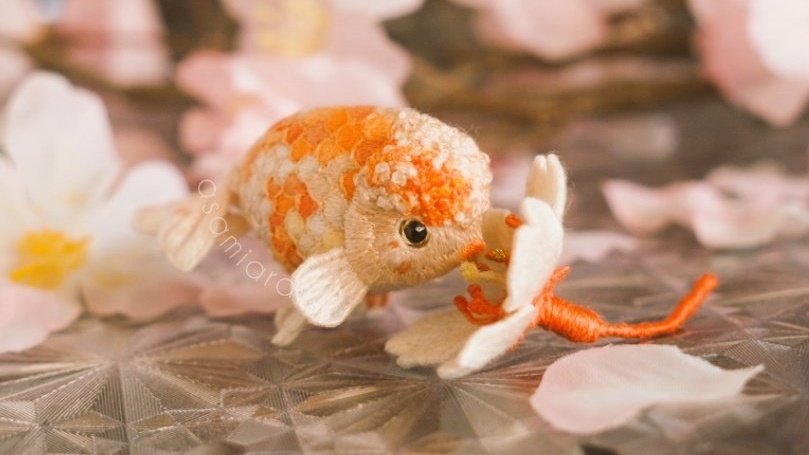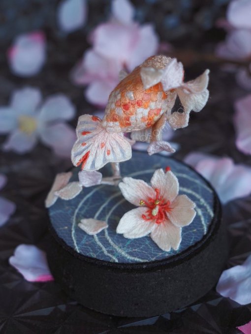 #季節ほのめく芸術春祭2023 刺繍で立体作品を作っています。 パーツ作りも組立ても、接着剤は使わずひたすら縫うだけで仕立てています。 桜と、桜錦 桜錦は花びらを意識した「サクラ尾」です。(本物の金魚に実際ある尾の名前) 春を感じていただけたら嬉しいです🌸 #立体刺繍