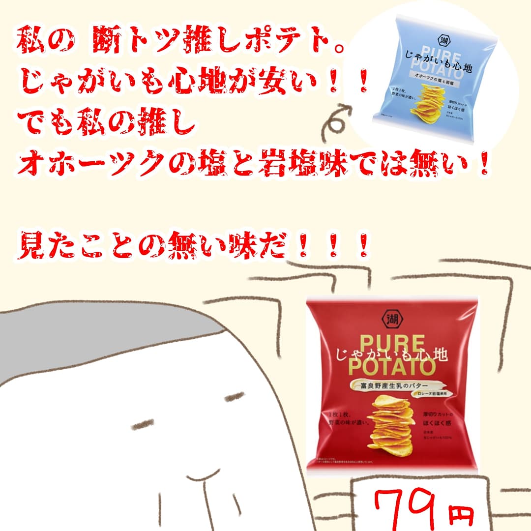 #漫画が読めるハッシュタグ 1推しのオホーツクの塩味を超えて美味しかったです♪ 2018年から季節限定で販売されてるらしい。 今まで知らなかったなんて(´TωT`) 年間通して販売して欲しいです! #季節限定 #じゃがいも心地 #富良野産生乳のバター #コイケヤ