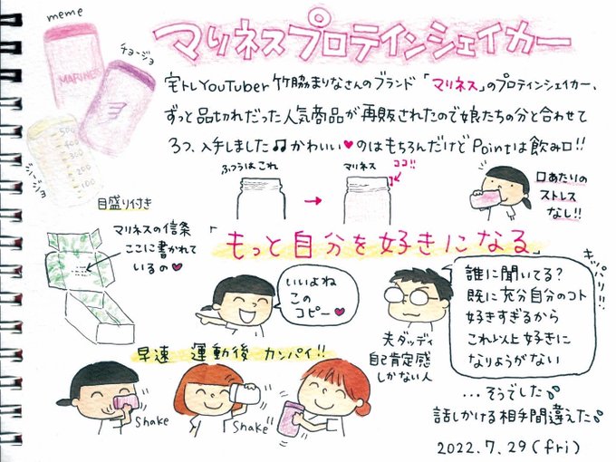 かわいいプロテインシェイカーを入手して宅トレモチベを上げました。 3枚目と4枚目の画像はジージョが撮影したもの。 #絵日記 #ダイエット #宅トレ #宅トレ女子 #マリネス #マリネスプロテインシェイカー #マリネスプロテイン2週間チャレンジ #マリネスプロテイン #もっと自分を好きになる #イラスト