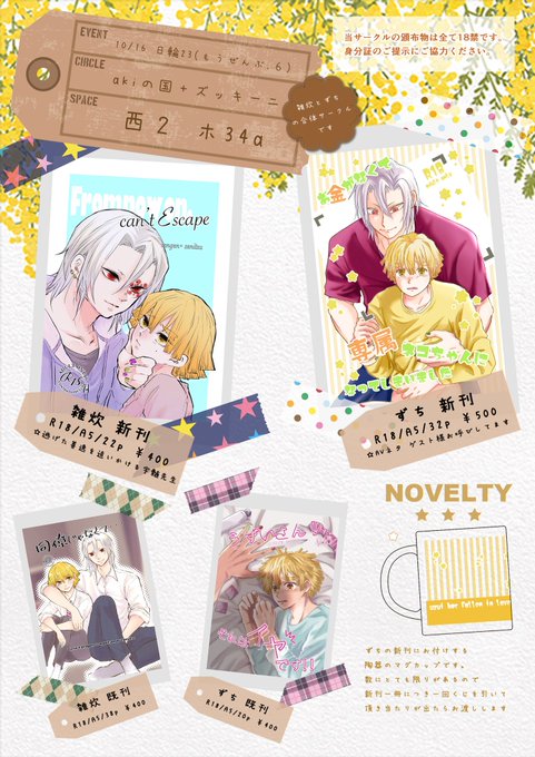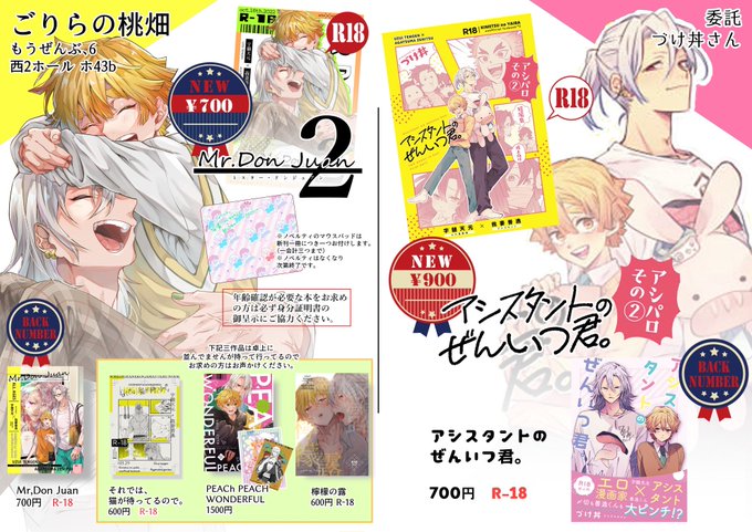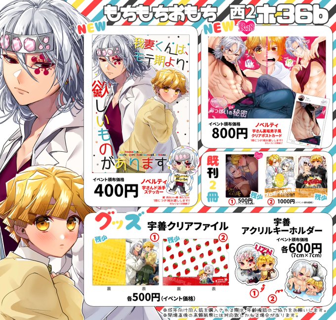 #宇善イベント_サークル参加します 【10/16 もうぜんぶ、6お品書き】 もうぜんぶ、6のお品書きです! 当日は卓上に上がってない本もあるのでお求めの方はお声掛けください。 年齢確認の必要なものは年齢確認出来るもののご用意お願いいたします。 pixiv.net/artworks/10195…