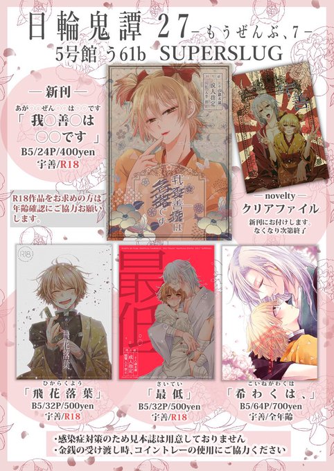 10/16 もうぜんぶ、6 お品書きです 西2ホ39b 「0203」 新刊と無配のみ 初めての👹滅&ン十年ぶりのイベントでド緊張しています 当日は何卒よろしくお願いします…! 迷ったら ニシニホンサンキュー! と唱えると着きます✌️ お隣はらみなさんです🐈 #宇善イベント_サークル参加します