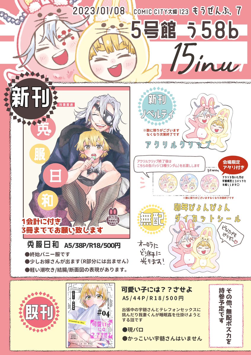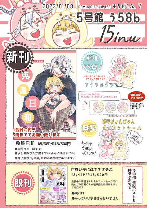 #宇善イベント_サークル参加します 1/8インテ もうぜんぶ、7おしながきです! 既刊と無配もあります! 無配はぴょんぴょん宇善シールです🐰❤️ ノベルティは無くなり次第終了です。 【新刊サンプル】 pixiv.net/artworks/10423… 【既刊サンプル】 pixiv.net/artworks/10191…