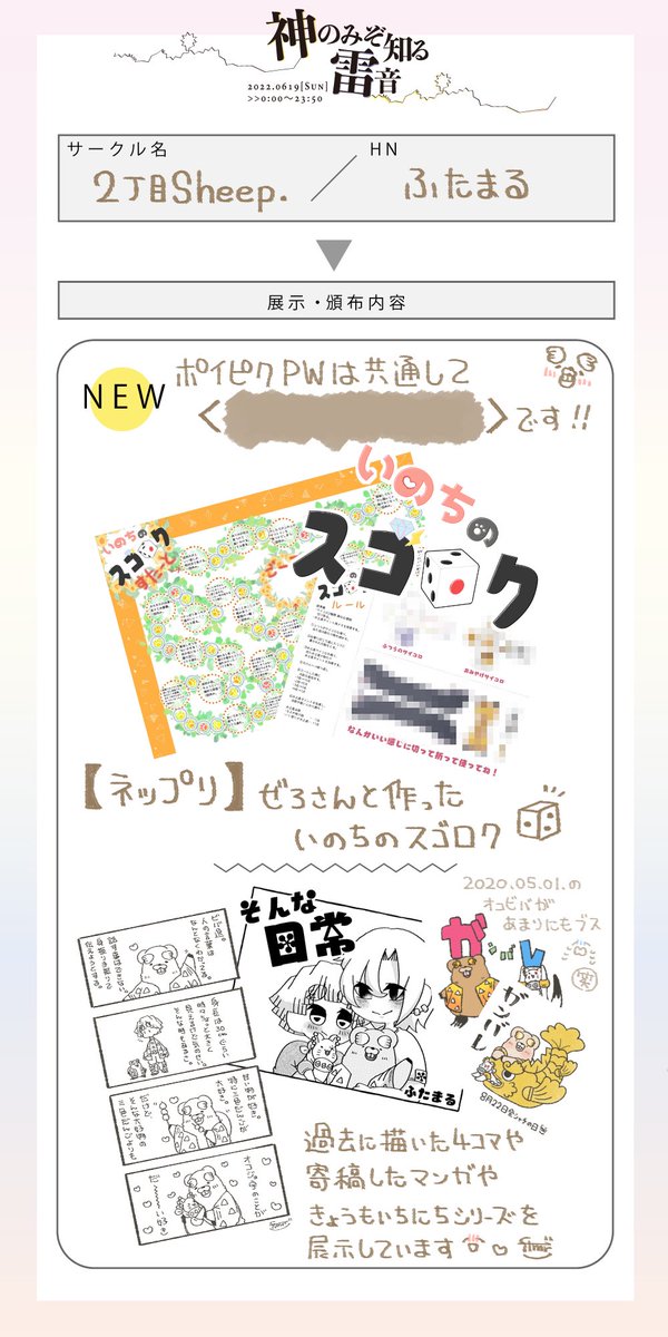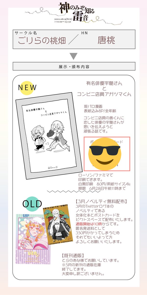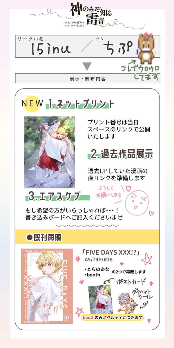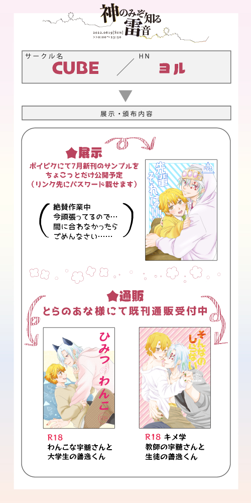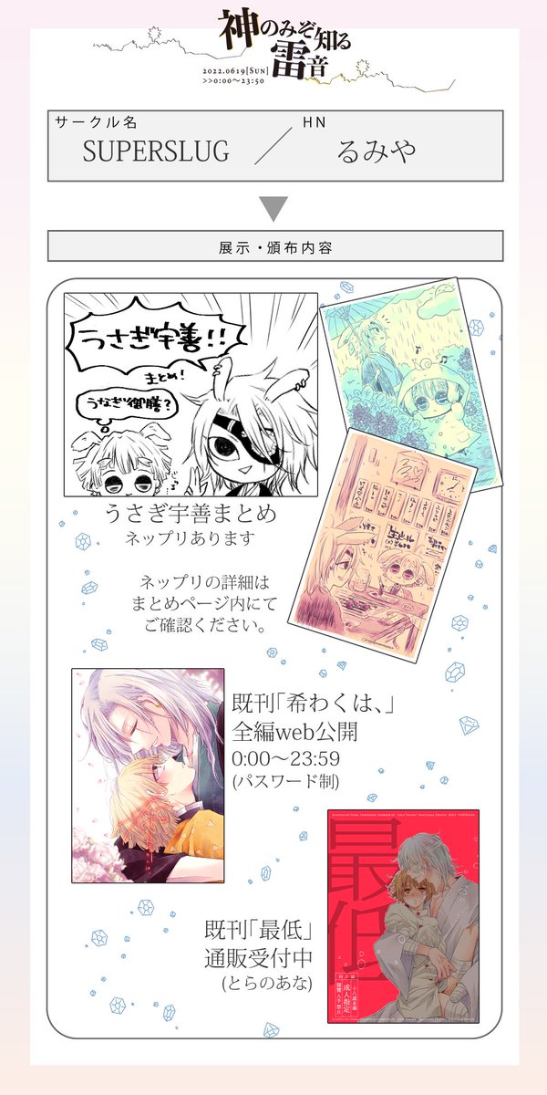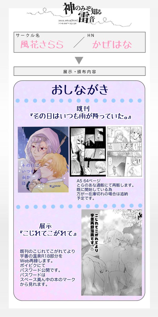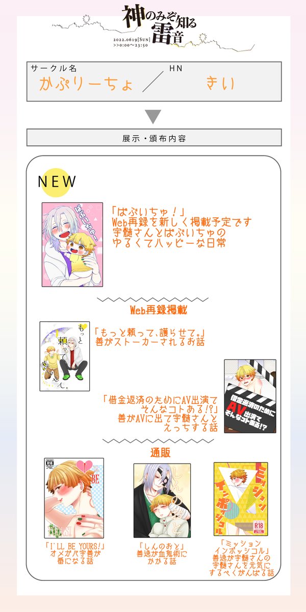 #神雷0619 #宇善WEBオンリー お品書きです。 既刊をとらさんにて通販、展示は昨年発行の既刊よりWeb再録があります❗️ 当日スペース真ん中の本からリンク予定です😆 使い方分かってないので挙動不審かもしれません😂
