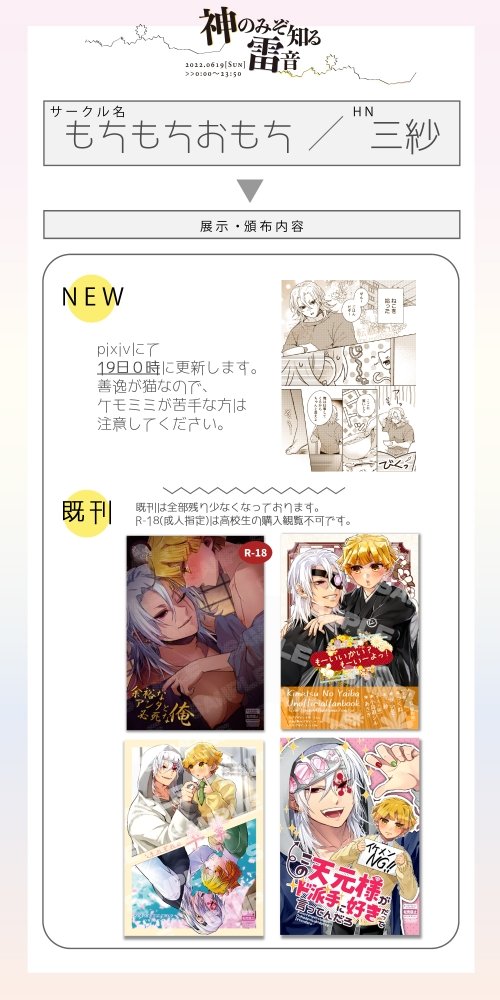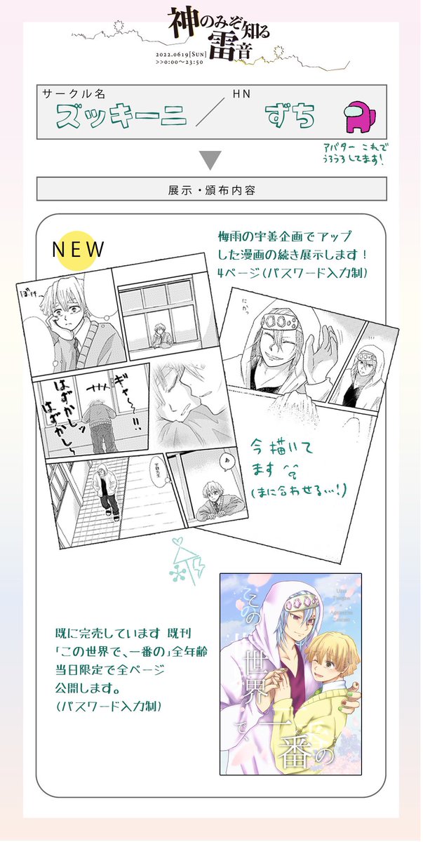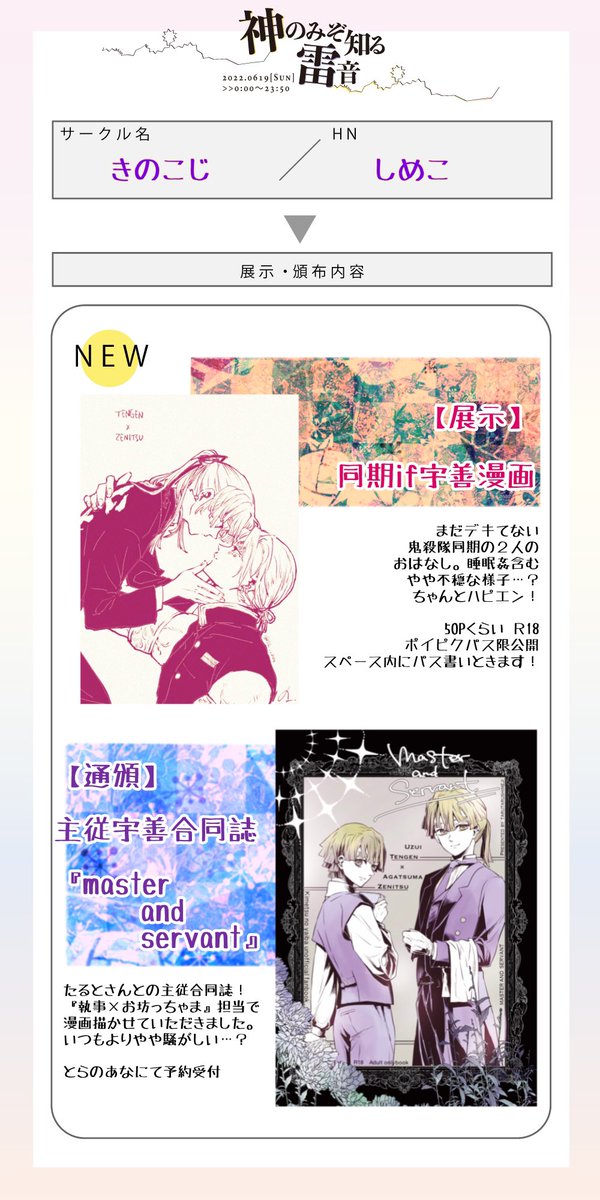 #神雷0619 #宇善WEBオンリー お品書きできましたー!! 展示まんがを0時に予約投稿とした為今はまだ展示リンクにURLを貼れません💦 取り次ぎお品書きをしぶ投稿してそのページを貼っております、0時になり予約投稿が表示され次第店舗リンクを貼り直します!! 事前に準備できず申し訳ありません🙇♀️💦
