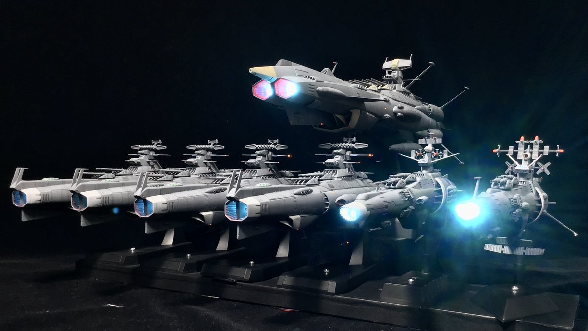 #宇宙戦艦ヤマト の #巡洋艦 完成しました。#Fusion360 でモデリング、#Satrun2 でSK水洗いレジンでの印刷です。全パーツ接着無しで組み上がります。1隻は設定に似たカラー、もう1隻は無人艦隊カラーをイメージして塗ってみました。(続く) twitter.com/i/web/status/1…