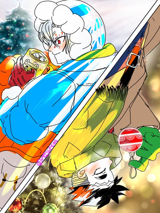 #宇悲ワンドロワンライ 【ク🎅リ🎄ス🎂マ🕯ス】お借りしました(背景は愛ビス素材) 💎先生にもこもこしてほしかったのと📿先生に🔴を見つめてほしかったの合体事故で、メチャ寒の海外へ🖼描きに行ってる💎先生と待ってる📿先生という謎シチュが誕生 ラブいけど遠距離になったのでもう一個描きたいネ