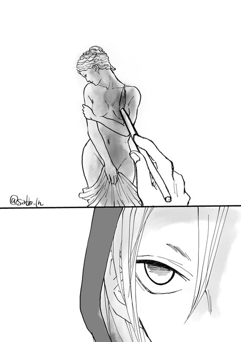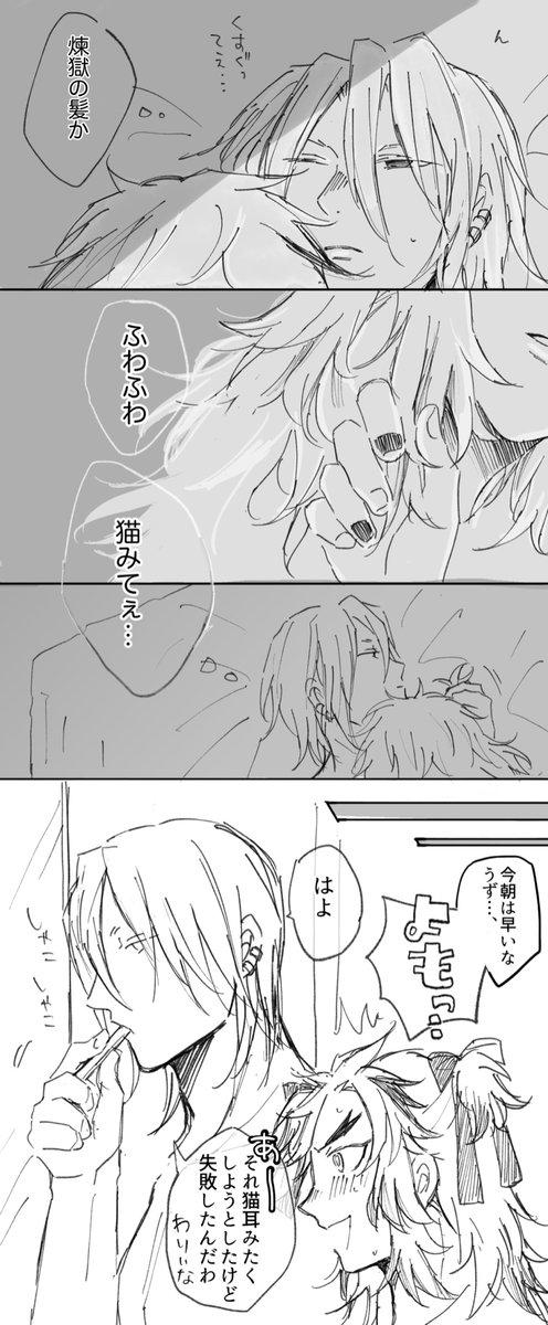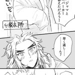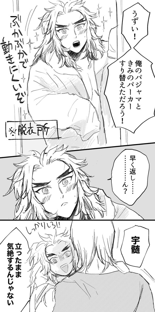 #宇煉ワンドロワンライ(@uren_1h_RT) 15分遅刻です〜 お題【 彼シャツ(シャツ以外OK) or 裸婦像 or 筆】 ちょっと謎軸🙄🙄宇さんの家にお泊まりした煉さん👉 1枚目の像は見ながらざっくり描きました〜まずければ消します〜