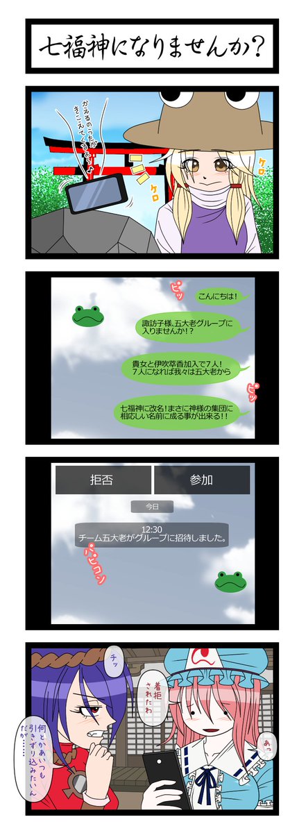 七福神になりませんか?📲 UPしました。 pixiv.net/artworks/97843… #東方Project #イラスト #4コマ #守矢諏訪子 #イラスト好きさんと繋がりたい #東方好きと繋がりたい #東方絵描きさんと繋がりたい
