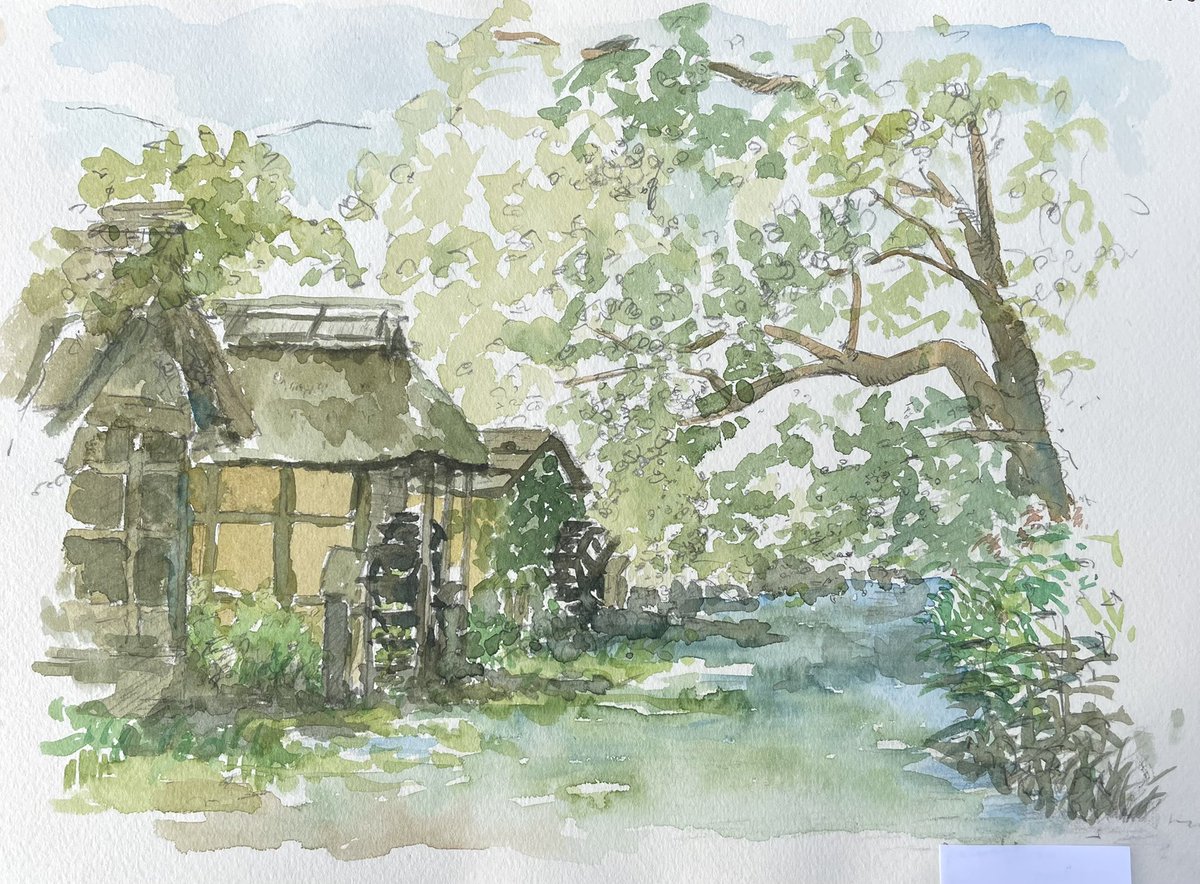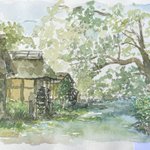 #ArtistOnTwitter #みんなで楽しむTwitter展覧会 #Watercolor #水彩画 #安曇野 #大王わさび農場 黒澤明監督作品「夢」の最終章「水車のある村」。 そのロケ地になった安曇野大王わさび農場、水車小屋をスケッチ。 そこは、清冽な水が流れていました。