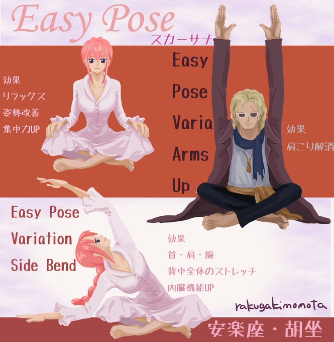 #スカーレット お誕生日おめでとうございます🎉 本日のおうちヨガしませんか? やっぱり #スカーサナ #安楽座 #胡座 なので やっぱり #コーザ と一緒に #onepiece #ヨガ #イラスト #EasyPoseVariation #EasyPoseSideBend #EasyPoseArmsUp