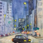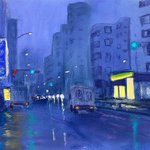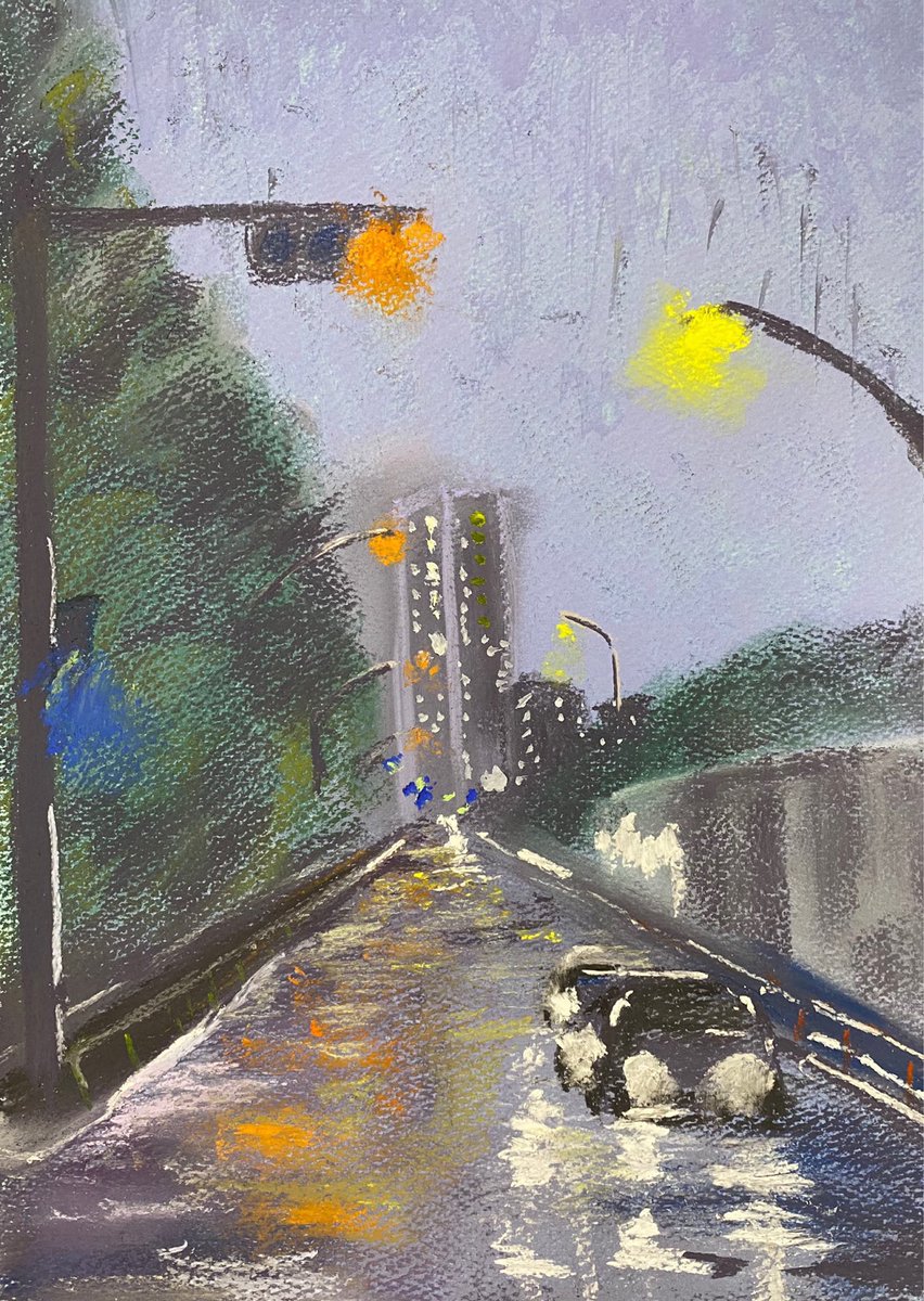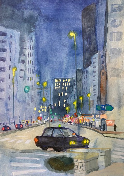 「雨の夜」32×41㎝(12.6×16.1in ) 夜の雨に濡れたアスファルトの魔力から離れられない… eichiro.thebase.in #谷内六郎 #安野光雅 #art #illustration #sketch #絵描きさんと繋がりたい #絵を描こう #絵本 #芸術の輪 #みんなで楽しむTwitter展覧会 #素朴画 #ナイーブアート #雨の絵
