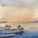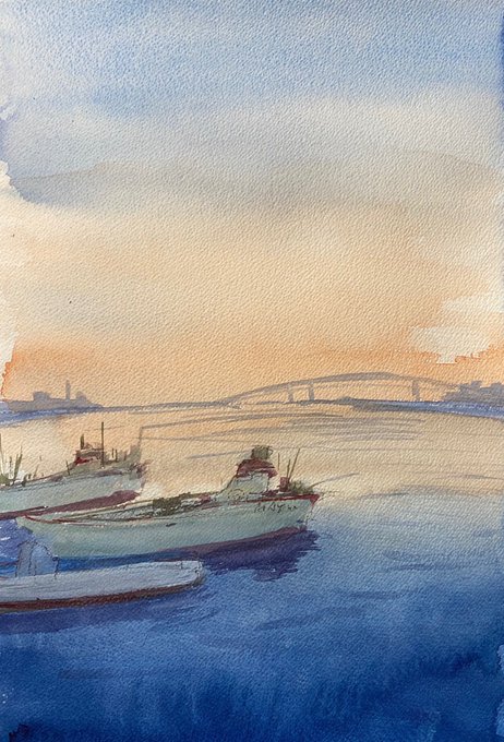 「夜明け 羽田・天空橋にて」水彩 BASEで販売もしてます。eichiro.thebase.in #谷内六郎 #安野光雅 #art #illustration #sketch #絵描きさんと繋がりたい #絵を描こう #絵本 #芸術の輪 #みんなで楽しむTwitter展覧会 #素朴画 #ナイーブアート #水彩画
