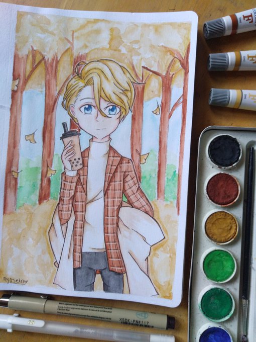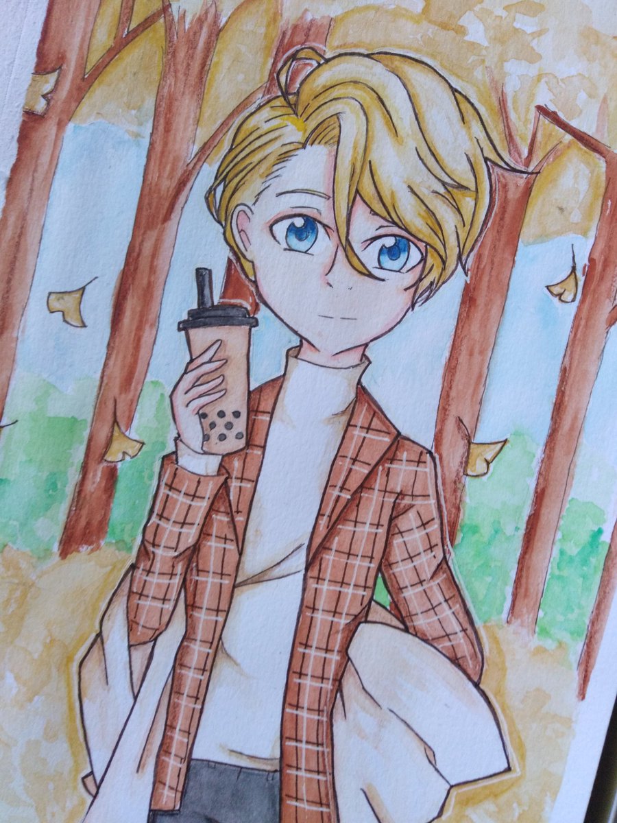 「Autumn🍂 」 I think Richard would really like the Royal Milk Tea boba 🧋🍂 I don't usually draw him but I liked the result ( ̄▽ ̄*)ゞ✨ #宝石商リチャード氏の謎鑑定 #TheCaseFilesOfJewelerRichard #HousekishouRichardshiNoNazoKantei #Watercolor