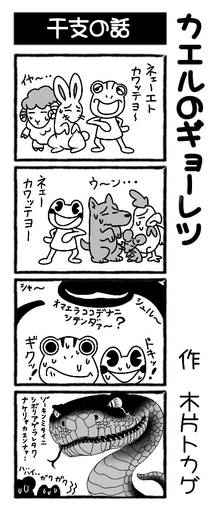 @chiplizard1 作 4コマ漫画 【カエルのギョーレツ】 twitterにて1日1話公開中! 第40回は『干支の話』です。 #漫画が読めるハッシュタグ #4コママンガ #4コマ漫画 #カエルのギョーレツ #干支 #蛇 #木片トカゲ #宣伝