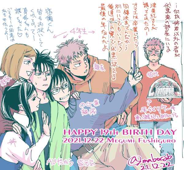 2018年を無事に生き延びたら16ちゃいになる恵ちゃん、今年は19ちゃい。呪専は4年制だそうなので、学生最後の誕生日で合ってる? 宿さんが🐯君の双子として転生した時空、🧠も活躍できずツミキちゃんは元気に大学生。 原作ツミキの心身共に無事生還祈念も兼ね… #宿伏の伏誕祭2021