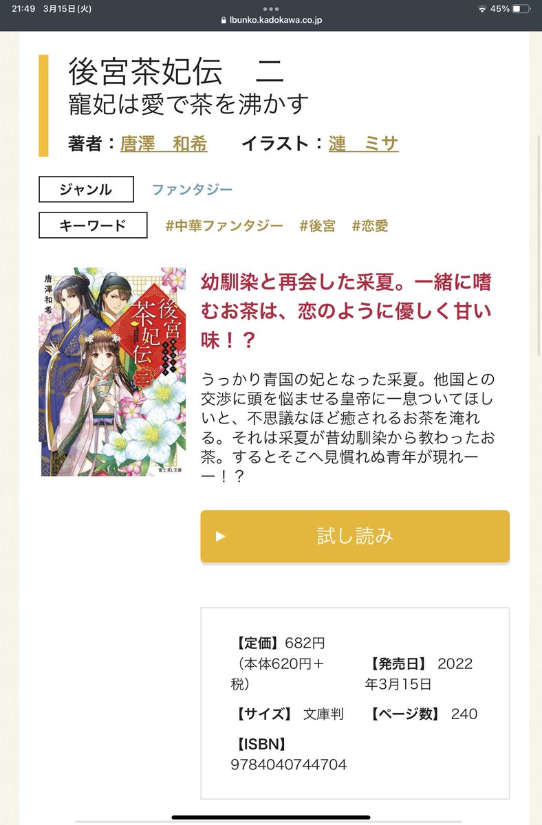 🫖本日発売 唐澤和希先生著『後宮茶妃伝 二 寵妃は愛で茶を沸かす 』 #富士見L文庫 の装画を描かせて頂きました! 今回はお茶好き少女「采夏」の幼馴染が登場して三角関係なイラストになりました。よろしくお願いいたします🍵 ▼公式HP試し読み lbunko.kadokawa.co.jp/product/cyakid…