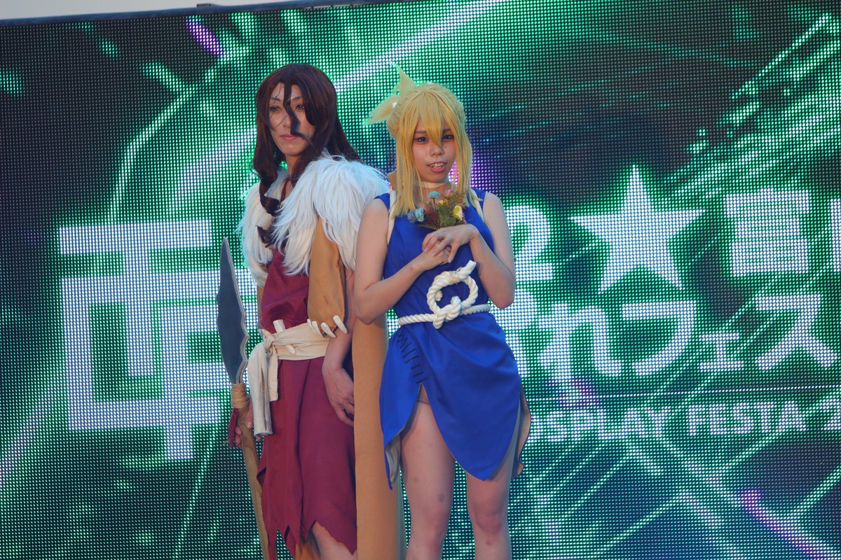 【富山こすぷれフェスタファッションショー】 Dr.STONE コハク 木陰ねる(@fantasyradioqun) Dr.STONE 獅子王 司 ユズリハ 撮影:あまみさん(@Sugar_Melody_) #富山こすぷれフェスタ #DrSTONE #ドクターストーン #コハク #獅子王司 #cosplay #DrSTONE司誕生祭
