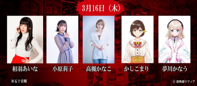 【マダミス即興劇:ザ・マフィア】 📢SPWNにてオンライン開催! 📢アーカイブ配信あり! \\🌟3月16日(木)キャスト🌟// 💎 #相羽あいな 💎 #小原莉子 💎 #高槻かなこ 💎 #かしこまり 💎 #夢川かなう 💎 #望月英(全公演出演) 詳細▼ event.spwn.jp/events/2303162… #マフィア即興劇