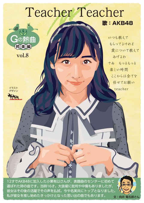 「Gの熱曲邦楽編」8回目です。今回は向井菊五郎さんの推し、 #小栗有以 さんがセンターを務めたAKB48の「Teacher Teacher」です。文章もお願いしました😙。3枚絵が続きます。まずは<1> #絵描きさんと繋がりたい