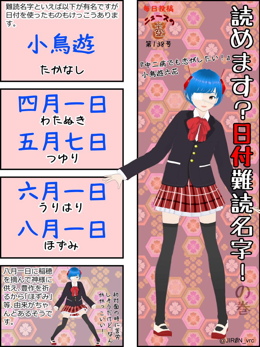 おはようございます! #ニュースの壷 「読めます?日付難読名字!」 『装甲騎兵ボトムズ』のキリコ・キュービィー役の郷田ほづみさん。「誕生日はひょっとして8月1日?」と思って調べてみたら8月22日でした。 #漫画が読めるハッシュタグ #小鳥遊六花 #中二病でも恋がしたい