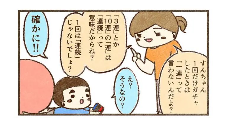 説明したら納得してたけど、もう口ぐせみたいになっちゃってるから結局「1連ガチャ」って言ってる😂 おはよう(^^) #育児漫画 #育児イラスト #子育て #小3 #コミックエッセイ #育児絵日記 #漫画が読めるハッシュタグ #Twitter交流会会場 #おは戦41027om 🌴 twitter.com/snsnblog/sta…