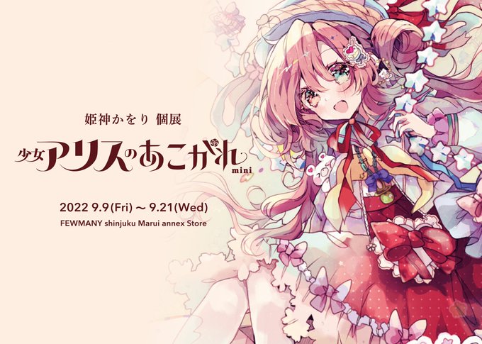 🌸告知🌸 姫神かをりミニ個展 「#少女アリスのあこがれmini」 ▫️会期:2022年9/9(金)~9/21(水) ▫️会場:新宿マルイアネックス 3F FEWMANY(@popspace_shop) アナログ原画&デジタルイラストの展示販売と、グッズの販売を行います🎀 よろしくお願いします…!